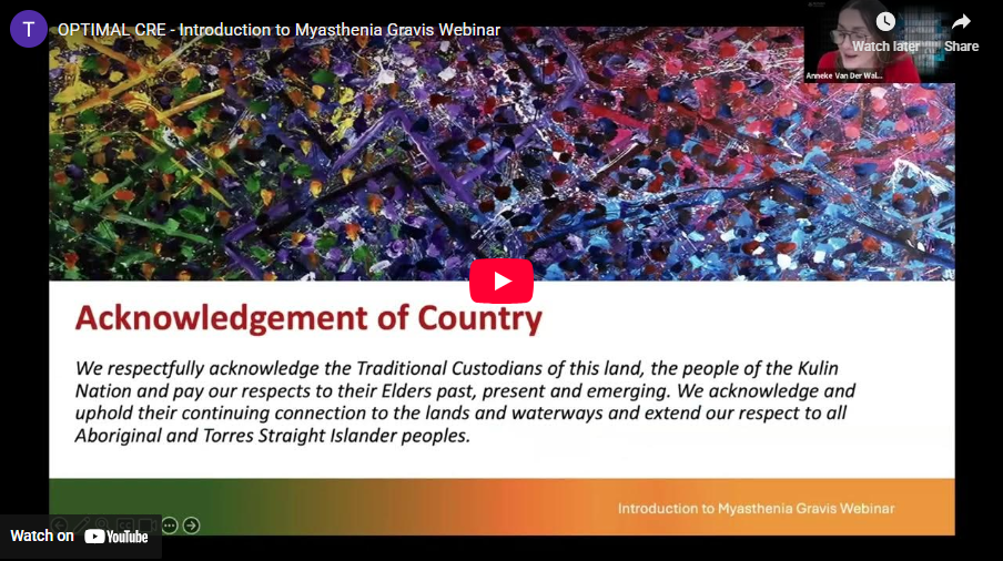 Delivered by the OPTIMAL NHMRC Centre of Research Excellence in improving immunoglobulin use, in partnership with Myasthenia Alliance Australia, this session provided: