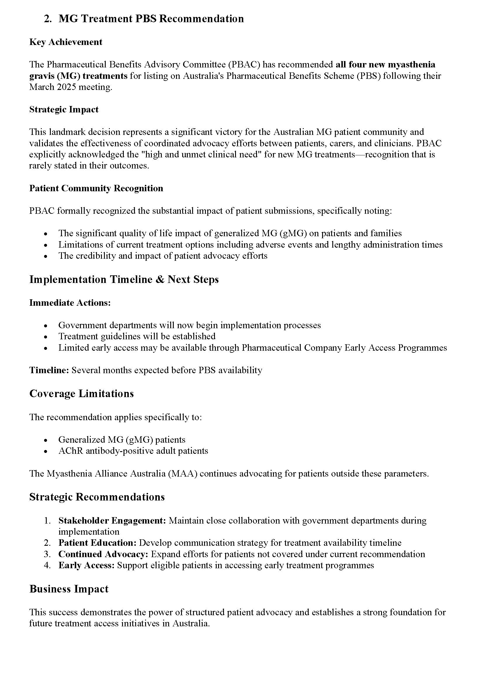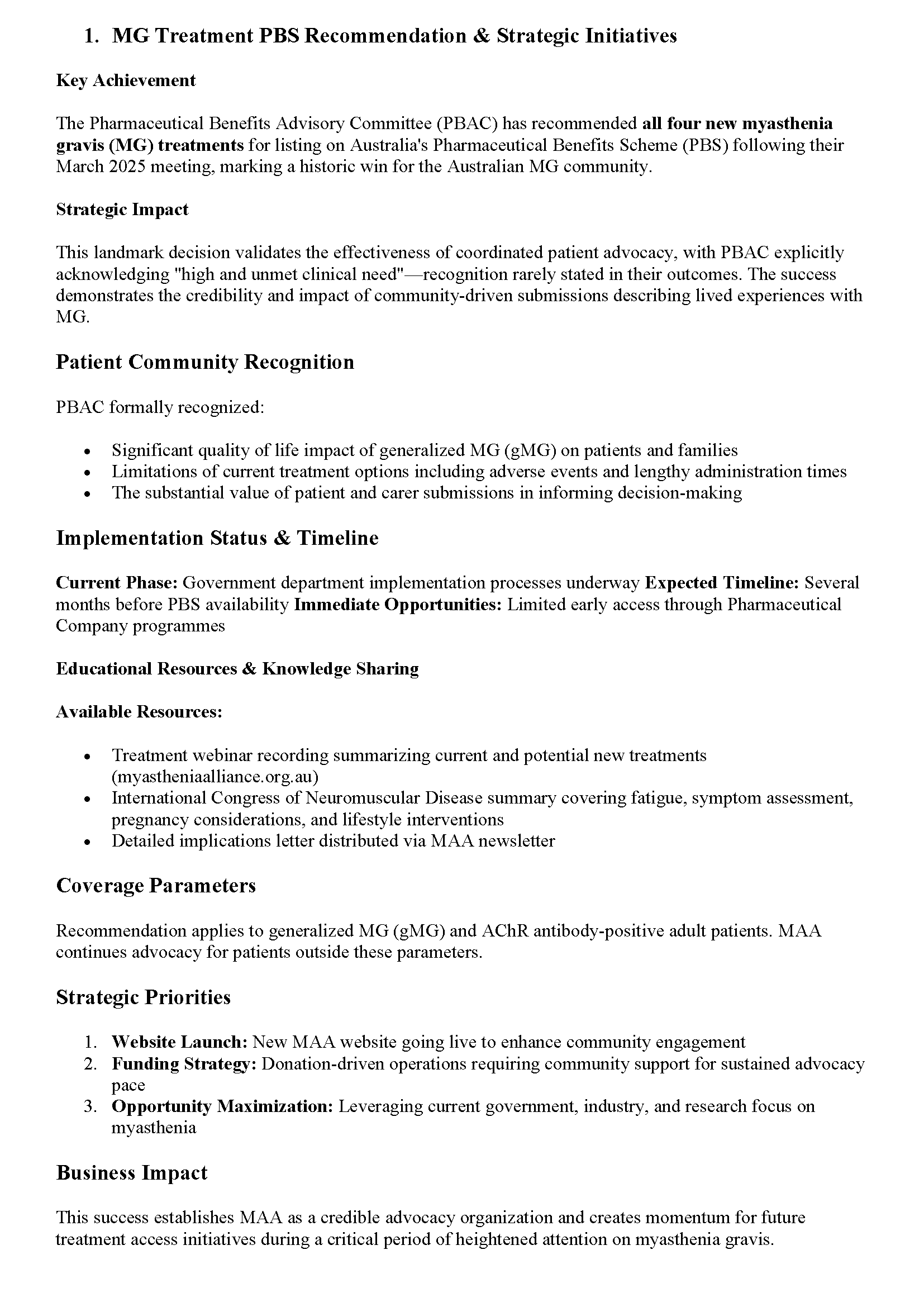 We are thrilled to share a landmark win for the Australian myasthenia gravis (MG) community: the Pharmaceutical Benefits Advisory Committee (PBAC) has officially recommended all four new MG treatments for listing on the Pharmaceutical Benefits Scheme (PBS). This recognition of the high and unmet clinical need, announced following the March 2025 PBAC meeting, is a powerful validation of the advocacy efforts led by patients, carers, and clinicians.