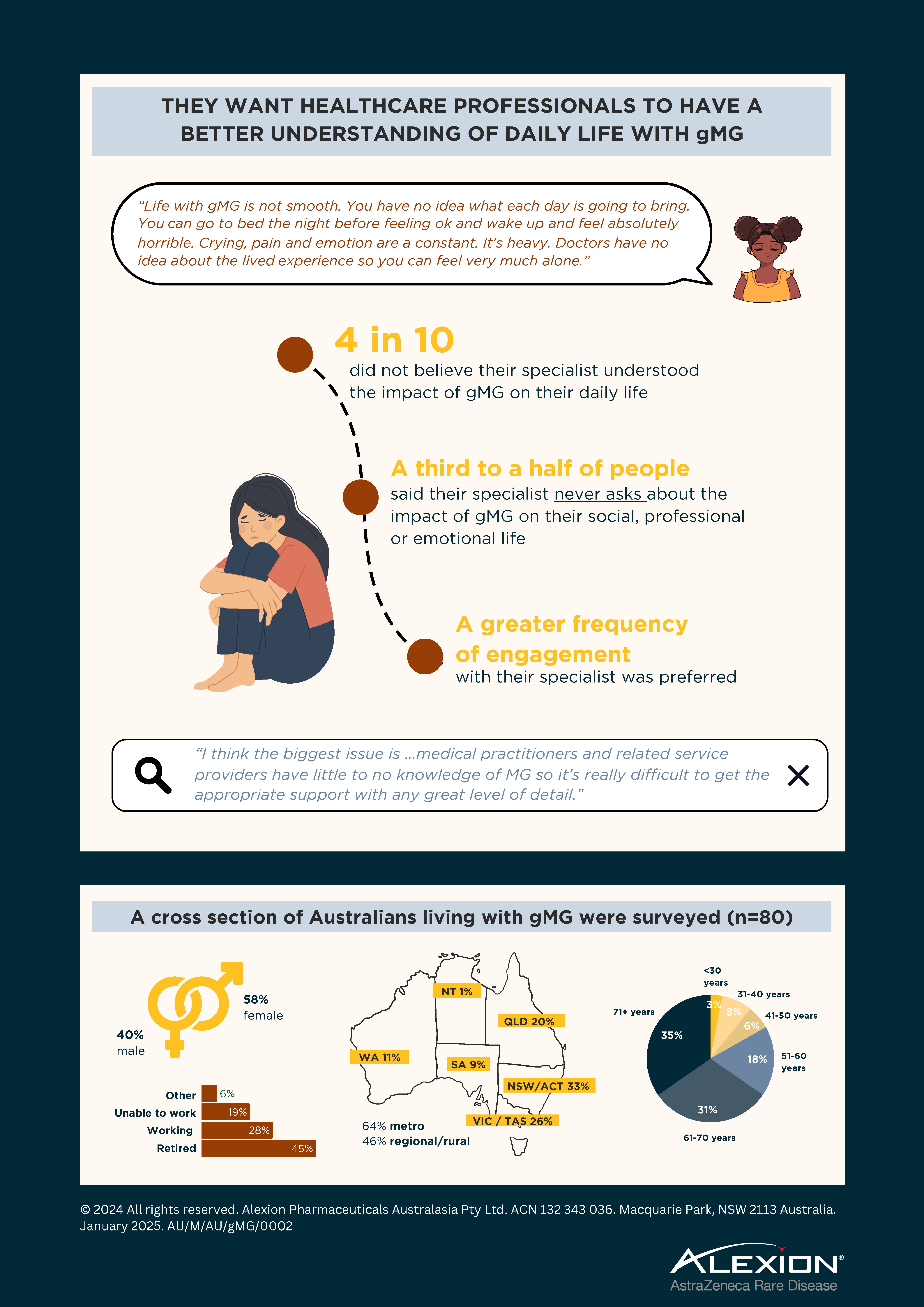 The survey found gMG has a significant impact on people’s social, personal and professional life with one in two retiring early. Restricted social life, loss of independence and the ability to plan activities were the most reported impacts.