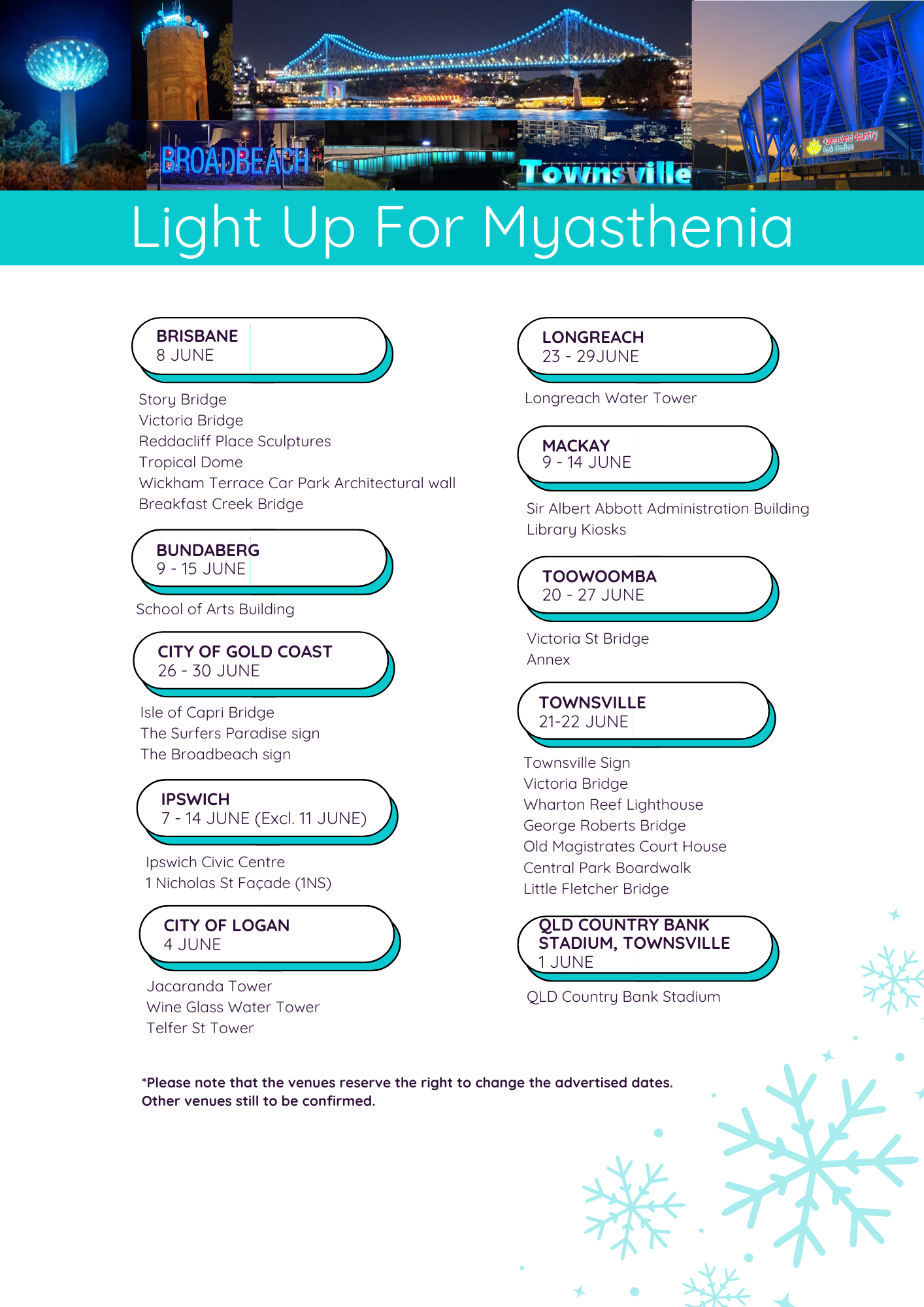 All across Queensland, landmarks will light up in teal throughout June to shine a light on Myasthenia Gravis.